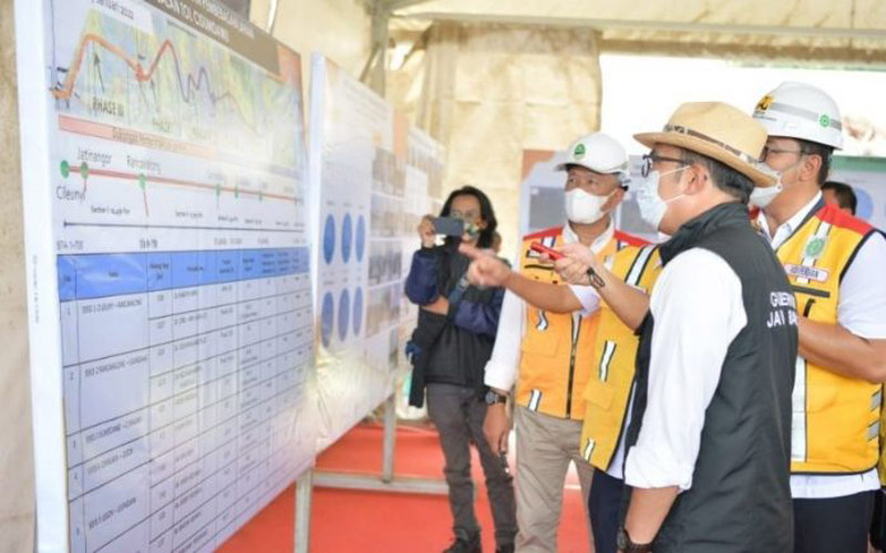 TODAY.ID | SUMEDANG – Gubernur Jawa Barat Ridwan Kamil meninjau progres proyek Jalan Tol Cileunyi – Sumedang – Dawuan (Cisumdawu) Seksi 1 di Kabupaten Sumedang, Senin (10/1/2022).