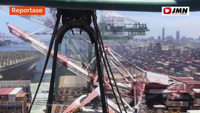 JMNChannel.com | Sebuah kapal kargo besar menabrak crane di sebuah pelabuhan di Taiwan pada Kamis (3/6/2021) siang. Crane yang tertabrak itu ambruk mengenai crane lain dan menimpa tumpukan kontainer di pelabuhan itu hingga berjatuhan.